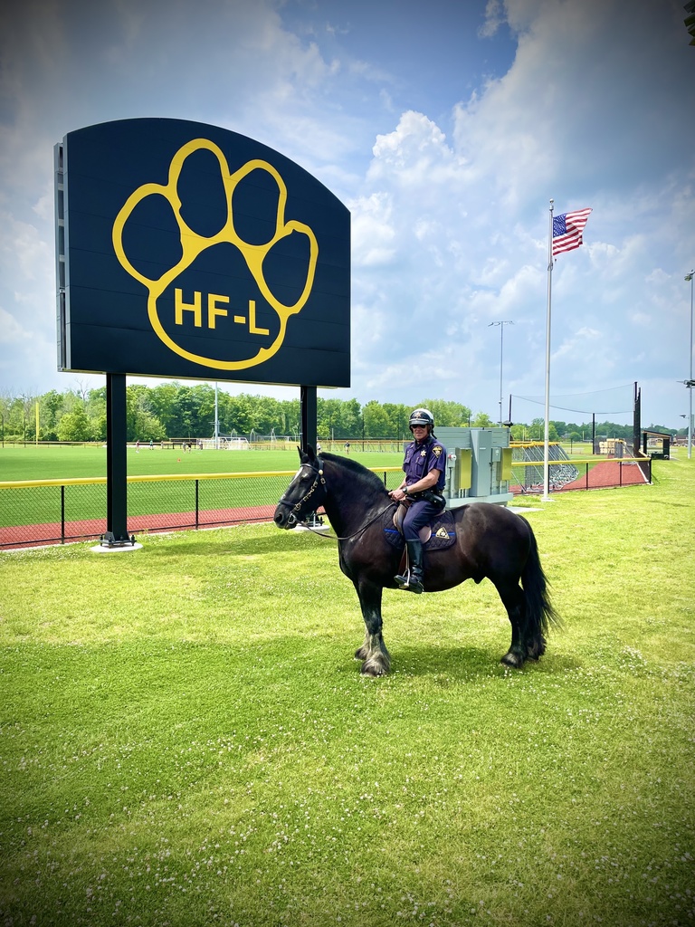 Deputy Friedlander and Deputy Furnal of @monroesheriffny Mounted Unit visited HF-L today. Deputy Friedlander is a long time member of the District's Safety Committee and is also a district resident. Thank you for coming out and conducting a mounted patrol of the campus! #WeAreHFL